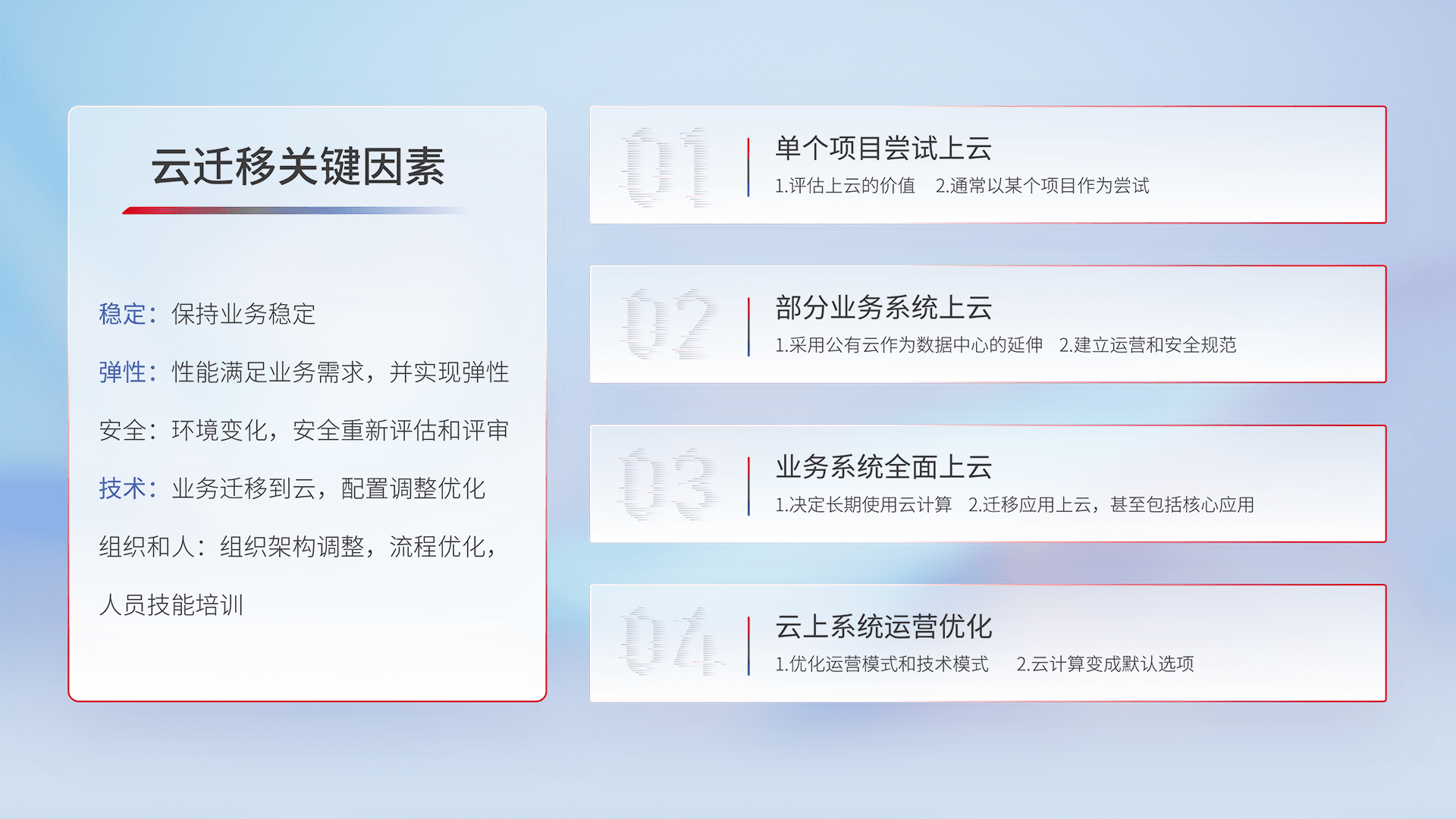 结合实际业务,,,从规划设计、、、、云平台选型、、云原生改造、、、数据迁移、、集成交付,,,迁移全过程为客户识别最佳上云路径,,,,做好风险识别管理,,,设计网络架构、、、身份权限、、、、安全审计合规、、操作审计、、、日志审计、、、监控告警策略、、多站点容灾设计等,,对云上基础设施进行整体规划,,,提升IT治理水平,,,以满足弹性、、、高可用、、、、高性能的需求。。