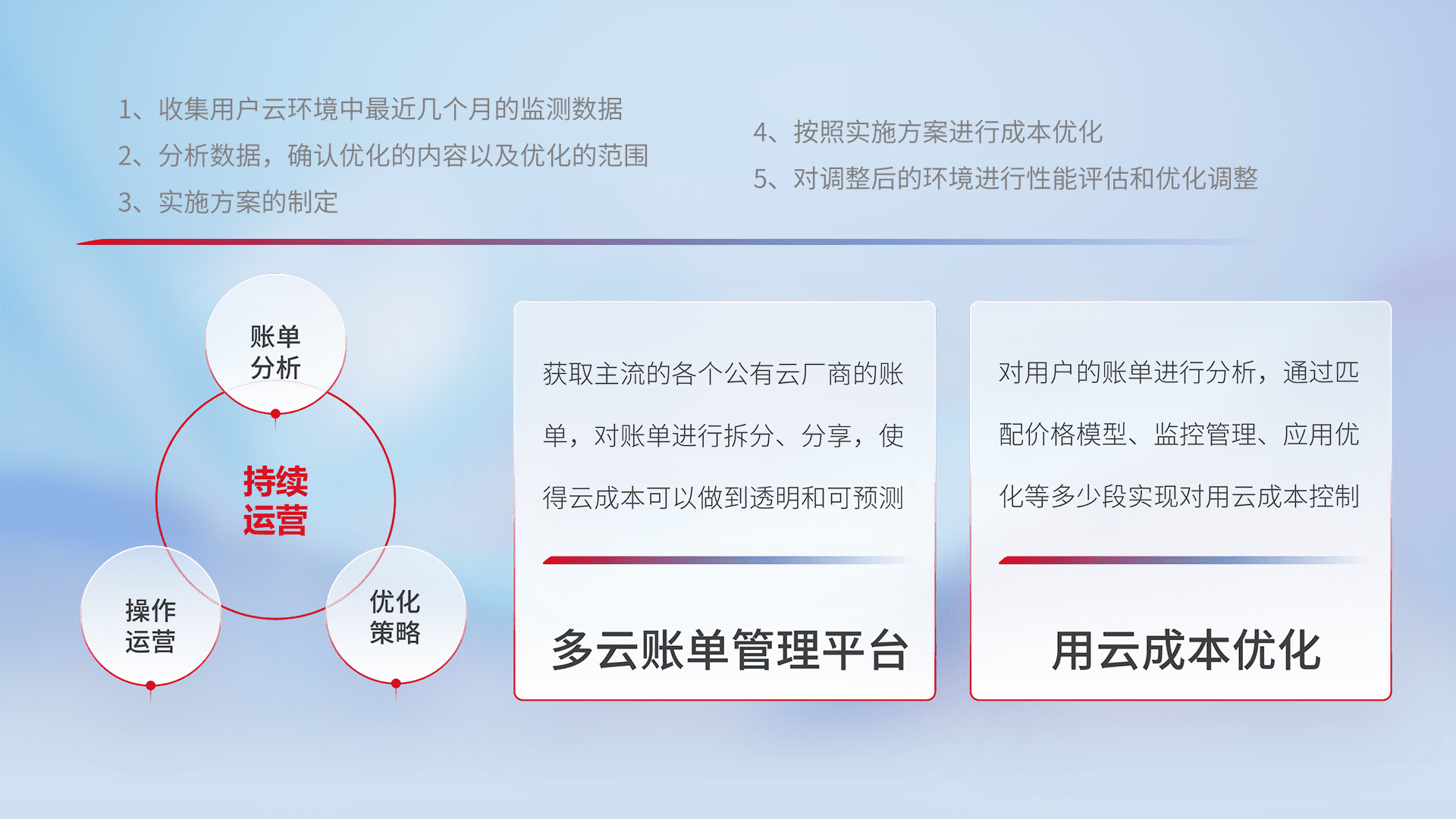 通过多云纳管,,,以统一的资源数据模型把客户的云资源进行抽象和封装,,,进而实现对多云资源的统一操作,,保障云资源管理的可靠性、、、、稳定性与可用性。。。量身定制化运维内容,,,配置、、、开发运维、、、、补丁管理、、、、备份、、、、监控、、、认证和访问管理、、审计和日常巡检等,,,保障在用云过程中的可靠度,,稳定度以及高可用率。。。